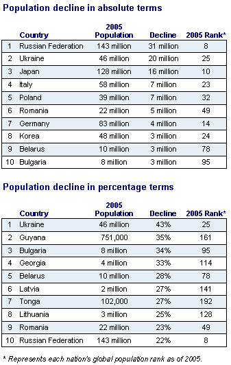 By mid-century, the populations of 51 countries are projected to be smaller than they are today. The Russian Federation will decrease in population the most, losing 31 million, followed by Ukraine (losing 20 million) and Japan (losing 16 million).
