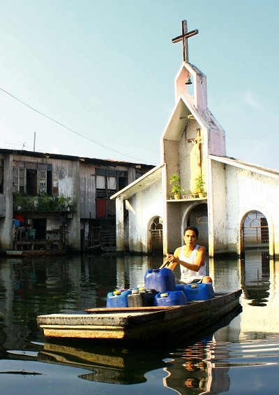 Normally, the water is around five feet deep, but after heavy rain it can double to 10 feet or more. Residents, mostly too poor to consider leaving, have long since adapted, buying or building boats to travel between homes, and even enjoying their status as a minor tourist attraction.