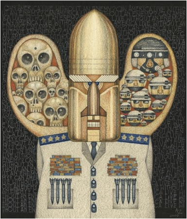 Another of his drawings, “Obama Drones” (2013), skewers President Obama for his use (or misuse) of unmanned drones in the war on terrorism, both at home and abroad.
