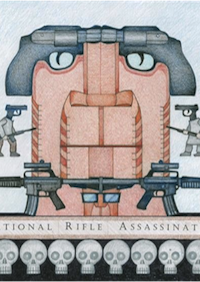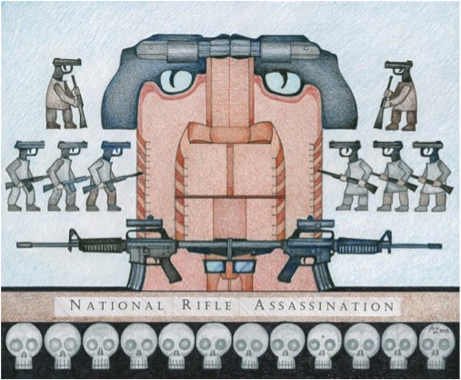 In “National Rifle Assassination (2013),” he points his finger directly at the U.S. gun lobby. Zukerman refuses to bow to the fictitious legal arguments that have made the United States the most violent country in the developed world.