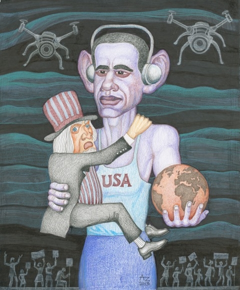 - One of Zukerman’s drawings skewers Obama for using unmanned drones in the war on terrorism.