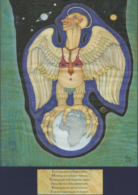 His disillusion with the American superpower, its economic system and ideologies is most evident in “The Empire” from 1999. He portrays the United States as a cross between an eagle and a vulture, its claws covering most of the globe it is trying to carry away to have all for itself.