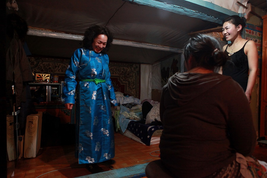 Muugi tries on her sister-in-law’s deel, a traditional long coat still widely worn in Mongolia, especially in the countryside.