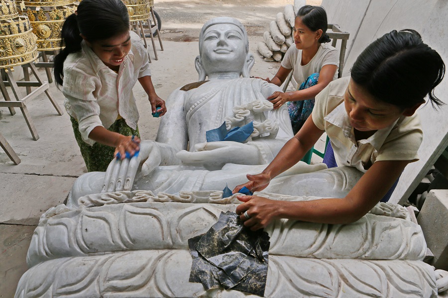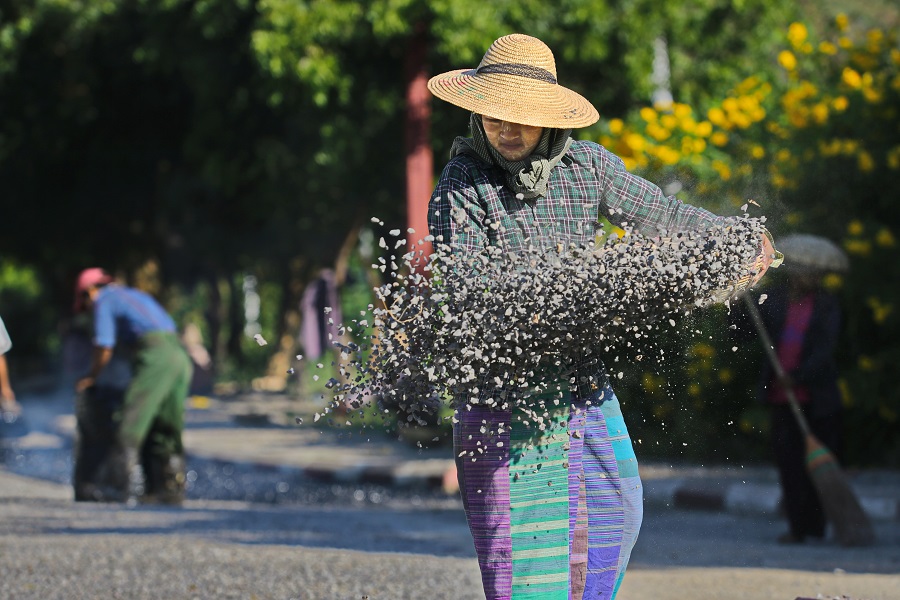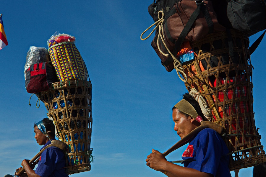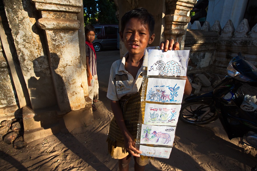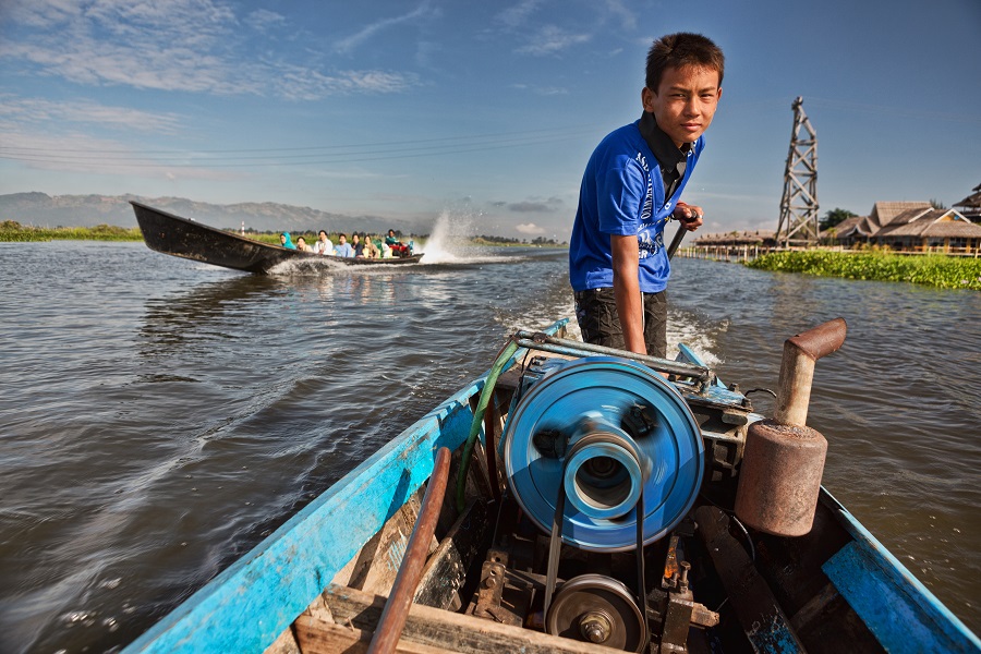 Sin Ko Ko Oo, 13, at the helm of his father’s long-tail boat on Shan state’s Inle Lake in central Myanmar. His father, tired after nearly a month of non-stop early morning work ferrying visitors around the lake for the Phaung Daw Oo Pagoda Festival, is dozing in the bow of the boat.