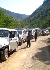 Up and up we drive into the mountains. People become sparse, trees thicker. After a little over an hour the pavement ends, revealing a deep red earth that contrasts beautifully with the dark green around us.