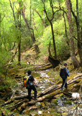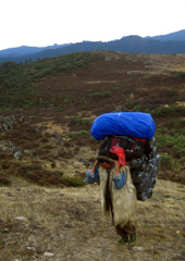 On and on we climb through the trees — conifers, firs, alpine grasslands and wild rhododendrons — until we come to a circle of buildings and a Tibetan shrine strung with prayer flags and emitting clouds of strong incense.