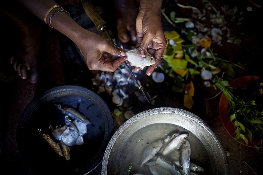 Shamila Nishanti, Sunil’s daughter, prepares fish caught by her father. His catch is often small – just a few fish, each just a few centimetres long, and not enough to feed his family.