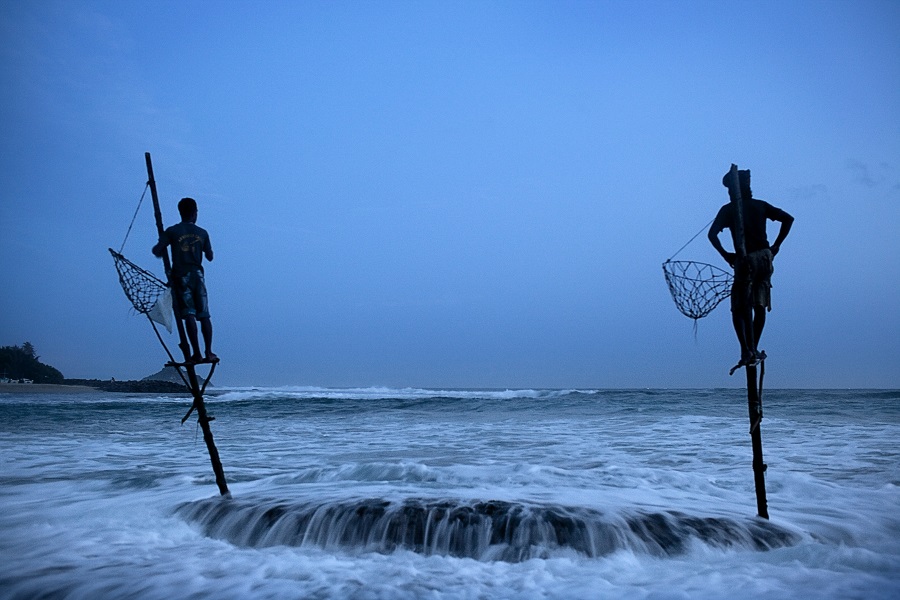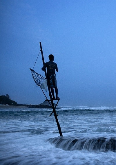 For 30 kilometers along Sri Lanka’s southern coast, between the towns of Unawatuna and Weilgama, fishermen such as Sunil Nishanti sit motionless on wooden stilts a few dozen meters from the shoreline.