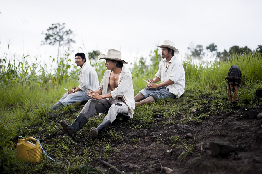 Brothers Miguel, Manuel and Rafael sharpen their machetes before starting work in their cornfields.