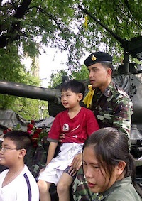 Coup supporters with a soldier during the 2006 military coup in Thailand. (via Wikimedia)