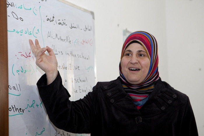 This Syrian refugee is teaching English at an International Rescue Committee Women’s Center in Irbid, Jordan. In addition to psychological counseling programs, the center offers social activities, including English classes among others. It is a place where the women and children can meet others like them in the camp and learn some new skills.