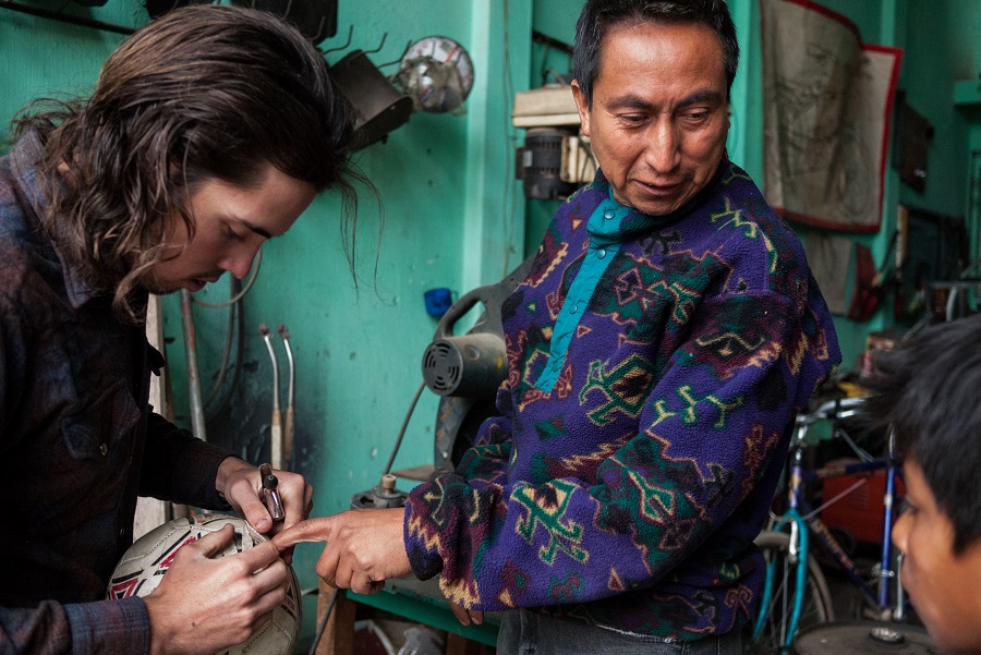 Carlos Enrique Marroquin, Maya Pedal’s director, oversees repairs to a football.