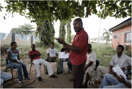 A café under the Association of Voiceover Artists (AVOA) from Nigeria is a meeting point for Nollywood artists and professionals. In this picture: Mr. Bimbo Manuel, actor and voiceover artist, Mr. Silo Bande, voiceover artist, and Ngozi Nwosy, an actress from the first Nollywood movie (“Living in Bondage”), seen here hugging Mr.Kinoshi Adedapo, a producer.