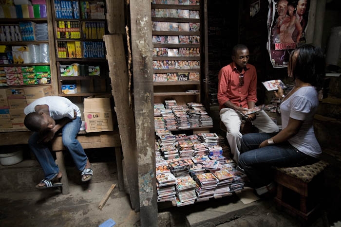 Frank sells a Nollywood movie to a young woman in his DVD shop at Lagos’s Idumota Market. Unlike Hollywood or Bollywood, the majority of Nollywood’s revenue comes from DVD sales, making piracy a major concern. According to the World Bank, sales of pirated Nollywood DVDs outnumber legitimate sales nine to one.