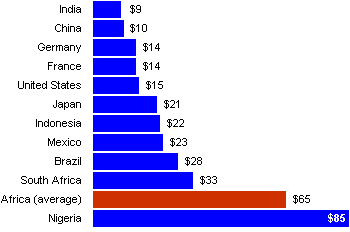 None of the world's 40 richest countries charges as much as $40 for Internet use per month, yet the average charge in Africa is $65. Of the nine countries that charge more than $100, seven are in Africa.