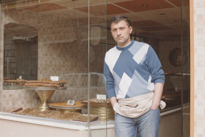 Maruan Makansi, 30, at the door of his traditional Arab cake shop near the mosque in Bustan Al Qasr district.
