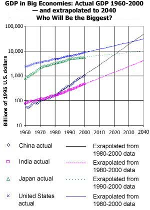 It also displays the two most populous countries, China and India. Trend growth since 1980 is extrapolated for each of these (for Japan, since 1990).
