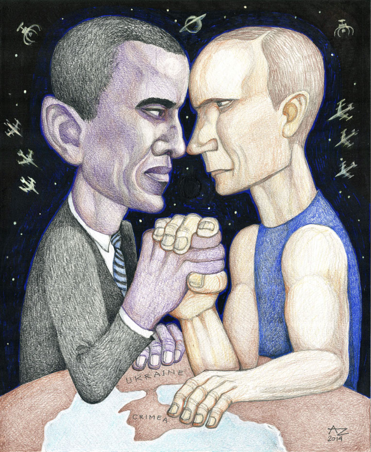 Presidents Obama and Putin arm-wrestling over Ukraine. Original art by Anatol Zukerman.