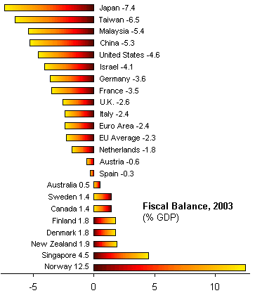 Not only is Japan running the highest budget deficit among industrialized countries at 7.4%, but its 2003 deficit approaches its 30-year high of 7.7%, a record set just the year before. Despite its former reputation for fiscal responsibility, Japan has not recorded a surplus since 1992.