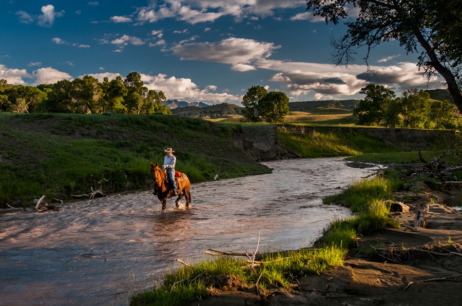 After a night of heavy rain, Megan rides across a creek to make sure the water isn’t too deep for cows to cross.